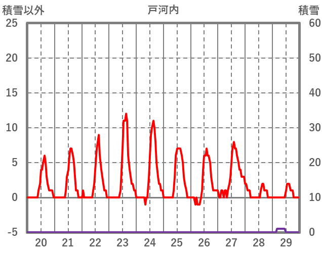 | 日 | 時 | 気温 | 降水 | 風向/風速 | 日照 | 積雪 | 降雪 |