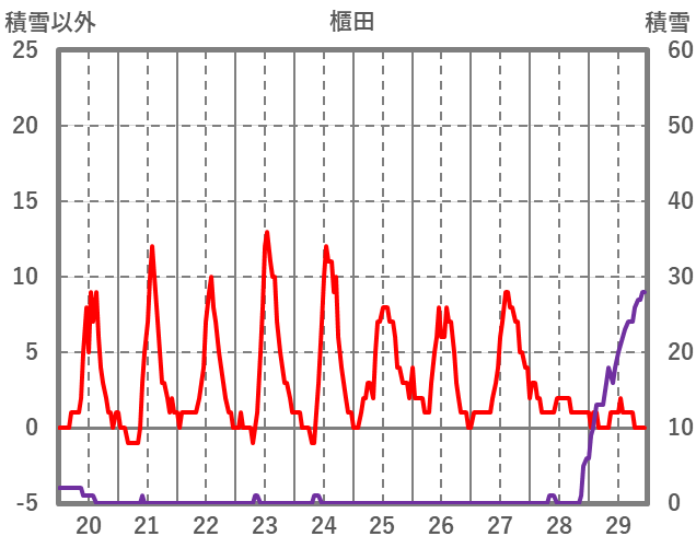 | 日 | 時 | 気温 | 降水 | 風向/風速 | 日照 | 積雪 | 降雪 |