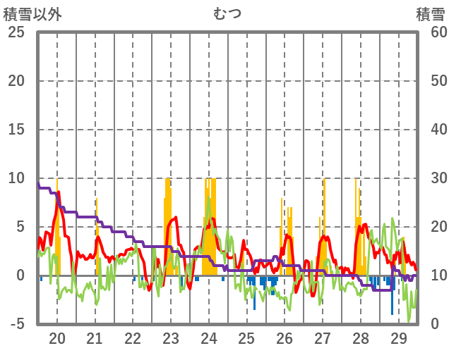| 日 | 時 | 気温 | 降水 | 風向/風速 | 日照 | 積雪 | 降雪 |
