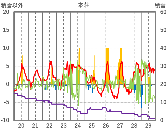 | 日 | 時 | 気温 | 降水 | 風向/風速 | 日照 | 積雪 | 降雪 |