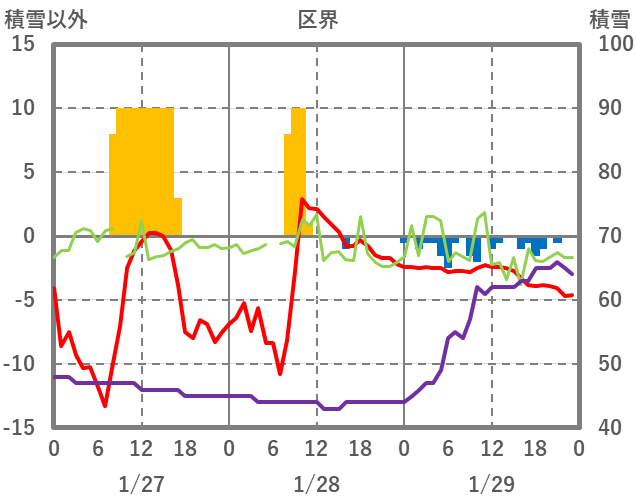 | 日 | 時 | 気温 | 降水 | 風向/風速 | 日照 | 積雪 | 降雪 |