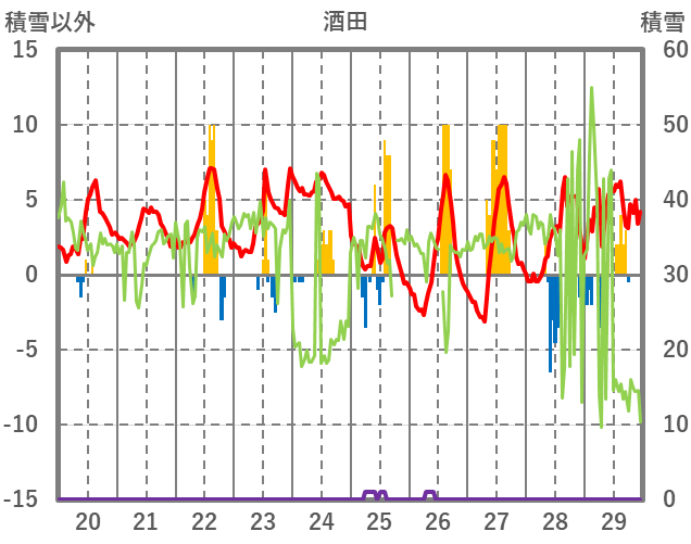 | 日 | 時 | 気温 | 降水 | 風向/風速 | 日照 | 積雪 | 降雪 |