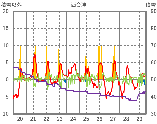 | 日 | 時 | 気温 | 降水 | 風向/風速 | 日照 | 積雪 | 降雪 |
