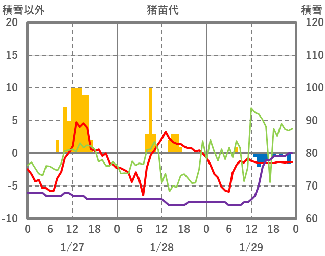 | 日 | 時 | 気温 | 降水 | 風向/風速 | 日照 | 積雪 | 降雪 |