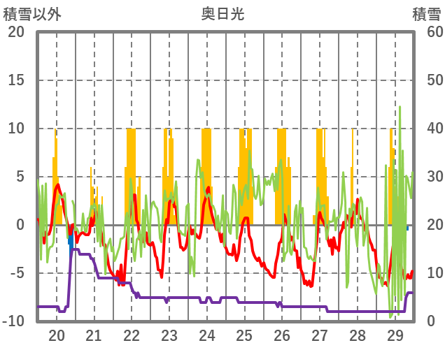 | 日 | 時 | 気温 | 降水 | 風向/風速 | 日照 | 積雪 | 降雪 |