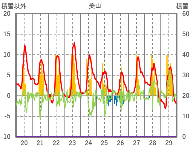 | 日 | 時 | 気温 | 降水 | 風向/風速 | 日照 | 積雪 | 降雪 |