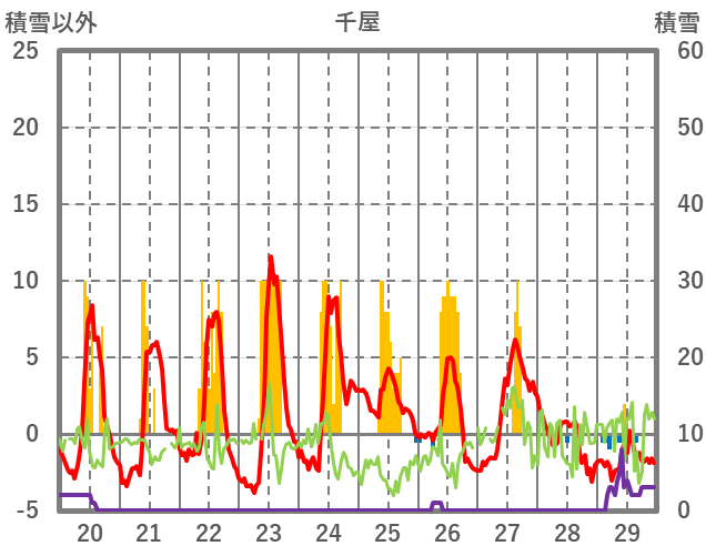 | 日 | 時 | 気温 | 降水 | 風向/風速 | 日照 | 積雪 | 降雪 |