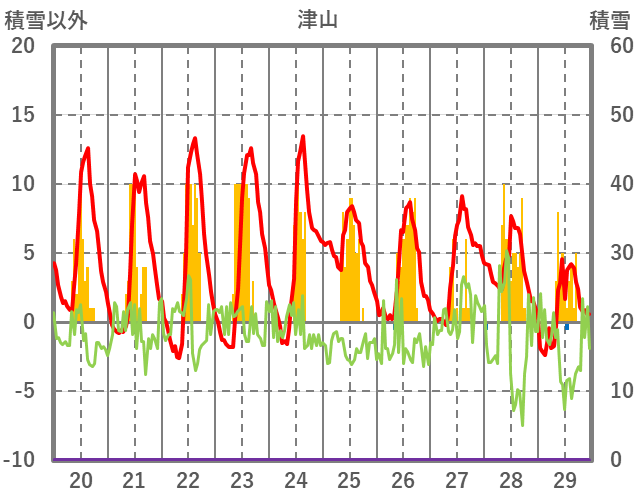 | 日 | 時 | 気温 | 降水 | 風向/風速 | 日照 | 積雪 | 降雪 |
