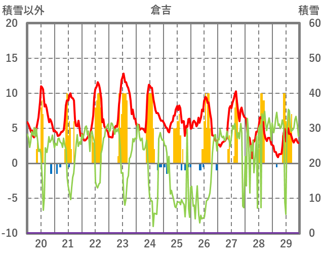 | 日 | 時 | 気温 | 降水 | 風向/風速 | 日照 | 積雪 | 降雪 |