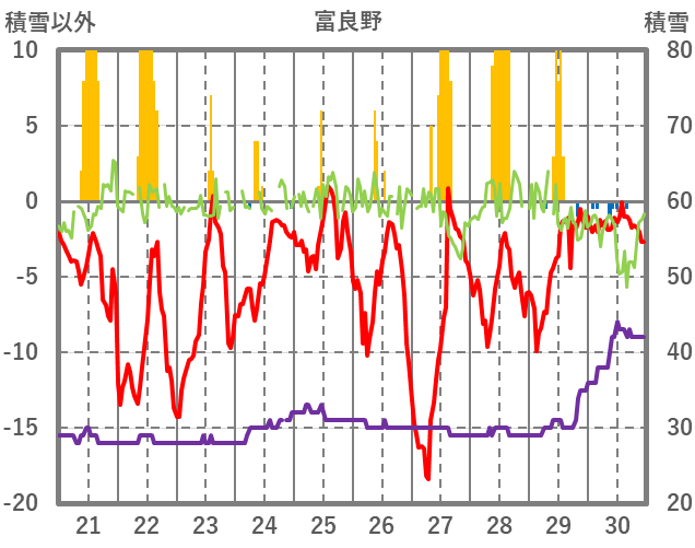| 日 | 時 | 気温 | 降水 | 風向/風速 | 日照 | 積雪 | 降雪 |