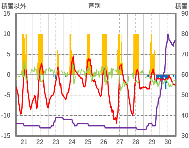 | 日 | 時 | 気温 | 降水 | 風向/風速 | 日照 | 積雪 | 降雪 |