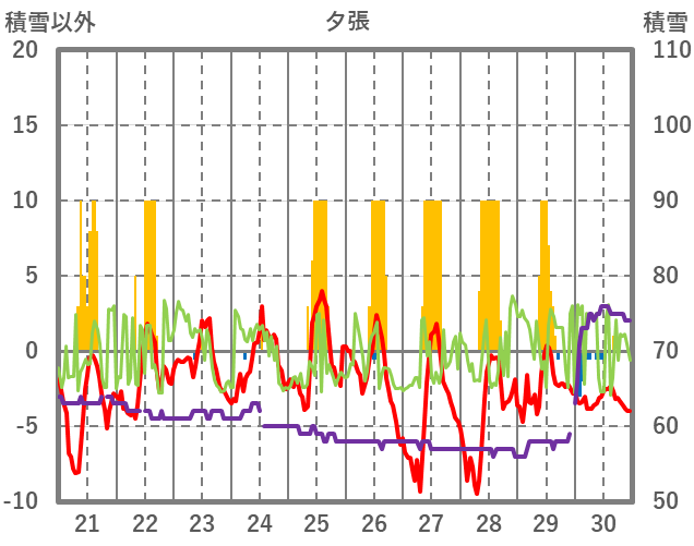 | 日 | 時 | 気温 | 降水 | 風向/風速 | 日照 | 積雪 | 降雪 |