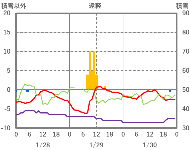 | 日 | 時 | 気温 | 降水 | 風向/風速 | 日照 | 積雪 | 降雪 |