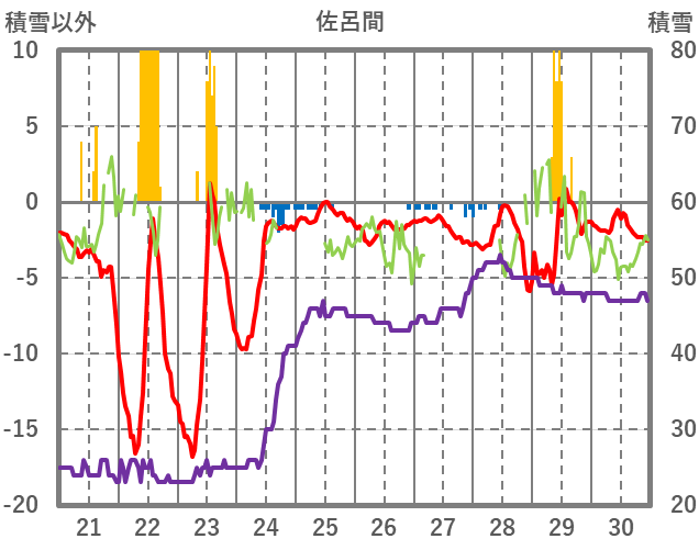 | 日 | 時 | 気温 | 降水 | 風向/風速 | 日照 | 積雪 | 降雪 |