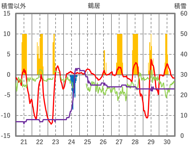 | 日 | 時 | 気温 | 降水 | 風向/風速 | 日照 | 積雪 | 降雪 |