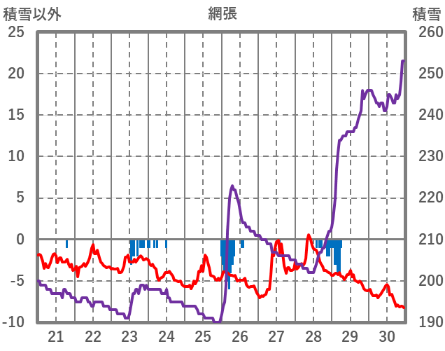 | 日 | 時 | 気温 | 降水 | 風向/風速 | 日照 | 積雪 | 降雪 |