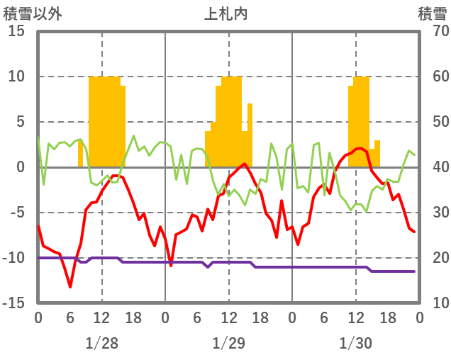 | 日 | 時 | 気温 | 降水 | 風向/風速 | 日照 | 積雪 | 降雪 |