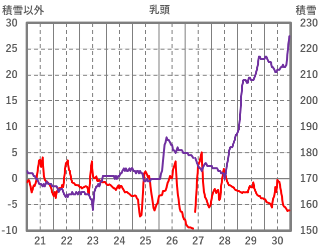 | 日 | 時 | 気温 | 降水 | 風向/風速 | 日照 | 積雪 | 降雪 |
