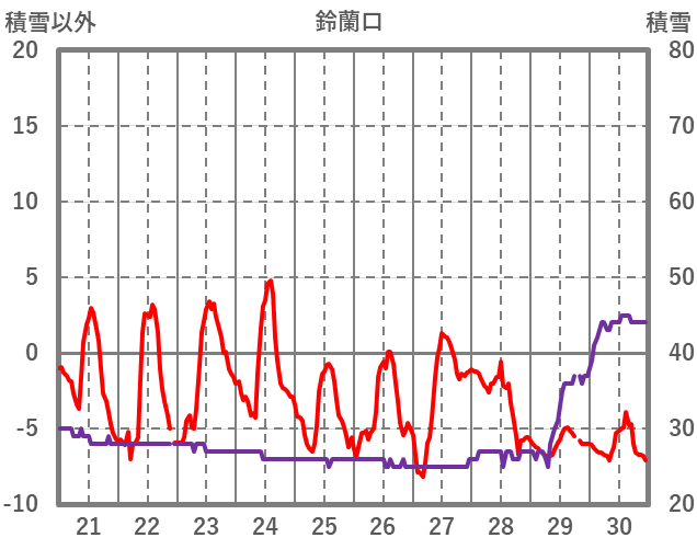 | 日 | 時 | 気温 | 降水 | 風向/風速 | 日照 | 積雪 | 降雪 |