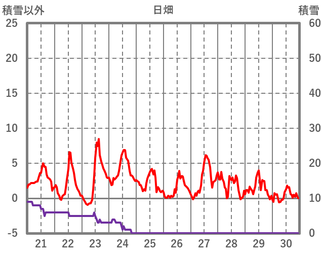 | 日 | 時 | 気温 | 降水 | 風向/風速 | 日照 | 積雪 | 降雪 |