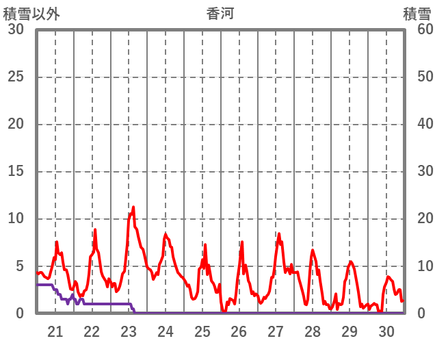 | 日 | 時 | 気温 | 降水 | 風向/風速 | 日照 | 積雪 | 降雪 |