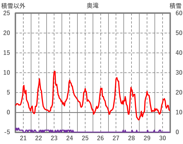 | 日 | 時 | 気温 | 降水 | 風向/風速 | 日照 | 積雪 | 降雪 |