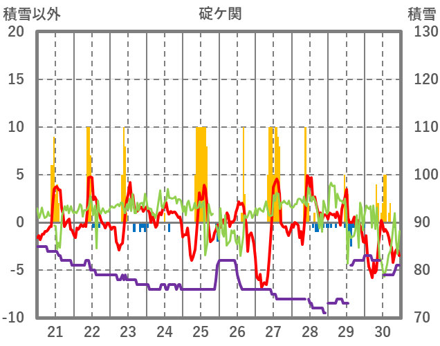 | 日 | 時 | 気温 | 降水 | 風向/風速 | 日照 | 積雪 | 降雪 |