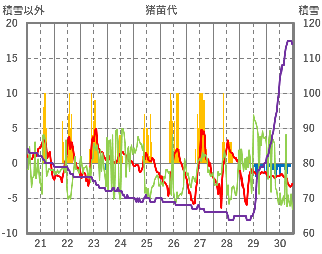 | 日 | 時 | 気温 | 降水 | 風向/風速 | 日照 | 積雪 | 降雪 |