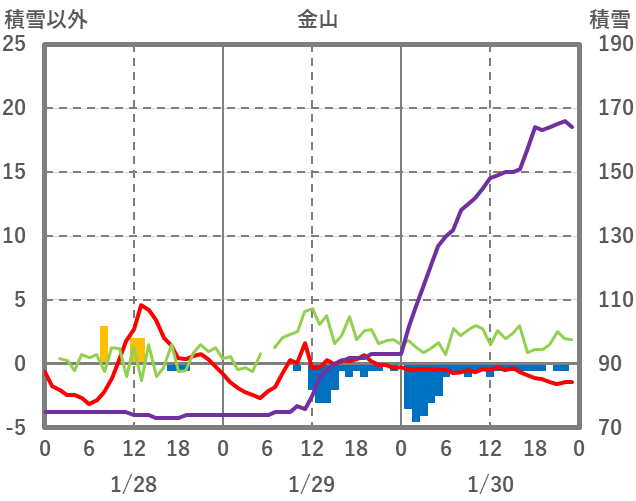 | 日 | 時 | 気温 | 降水 | 風向/風速 | 日照 | 積雪 | 降雪 |