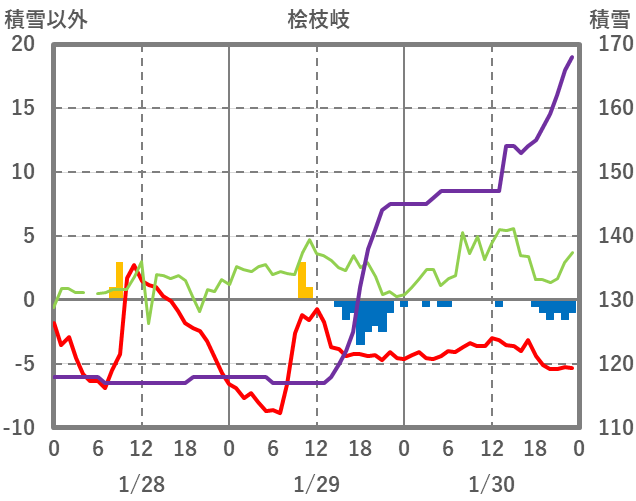 | 日 | 時 | 気温 | 降水 | 風向/風速 | 日照 | 積雪 | 降雪 |