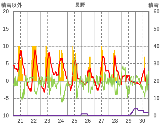 | 日 | 時 | 気温 | 降水 | 風向/風速 | 日照 | 積雪 | 降雪 |