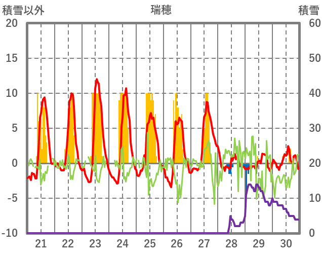 | 日 | 時 | 気温 | 降水 | 風向/風速 | 日照 | 積雪 | 降雪 |