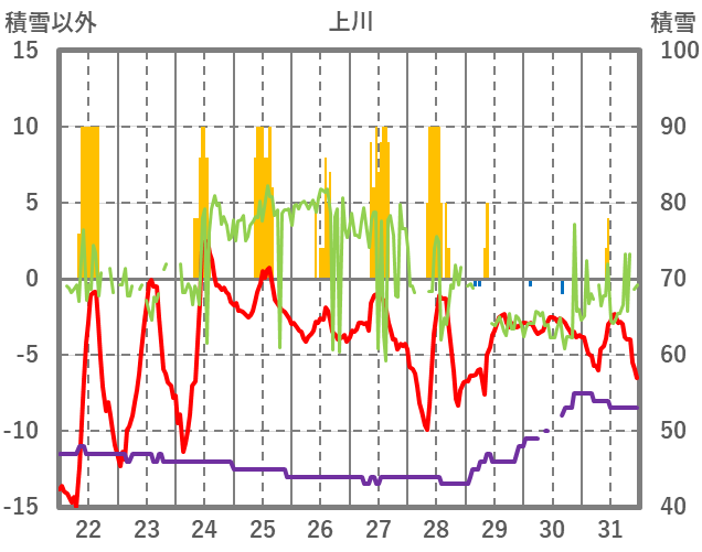 | 日 | 時 | 気温 | 降水 | 風向/風速 | 日照 | 積雪 | 降雪 |