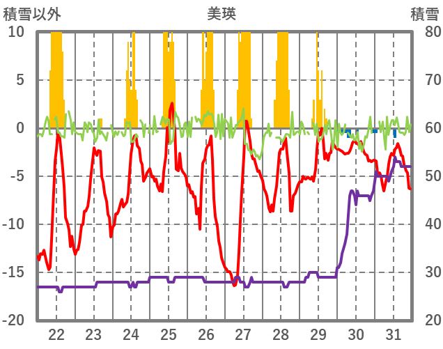 | 日 | 時 | 気温 | 降水 | 風向/風速 | 日照 | 積雪 | 降雪 |