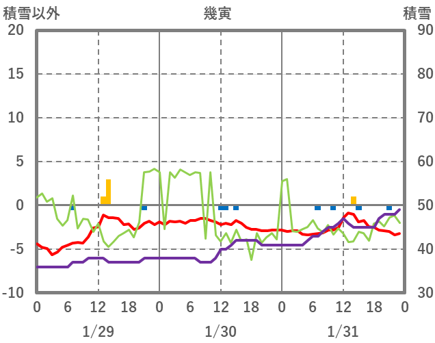 | 日 | 時 | 気温 | 降水 | 風向/風速 | 日照 | 積雪 | 降雪 |