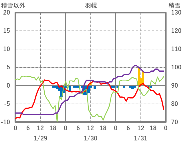 | 日 | 時 | 気温 | 降水 | 風向/風速 | 日照 | 積雪 | 降雪 |