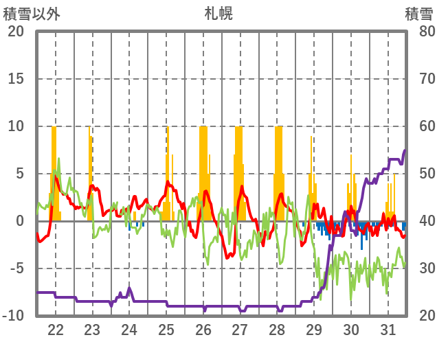 | 日 | 時 | 気温 | 降水 | 風向/風速 | 日照 | 積雪 | 降雪 |