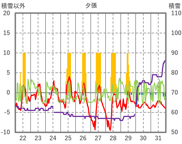 | 日 | 時 | 気温 | 降水 | 風向/風速 | 日照 | 積雪 | 降雪 |