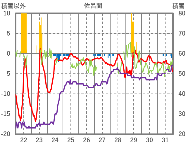 | 日 | 時 | 気温 | 降水 | 風向/風速 | 日照 | 積雪 | 降雪 |