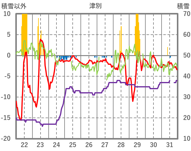| 日 | 時 | 気温 | 降水 | 風向/風速 | 日照 | 積雪 | 降雪 |