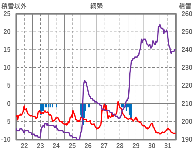 | 日 | 時 | 気温 | 降水 | 風向/風速 | 日照 | 積雪 | 降雪 |