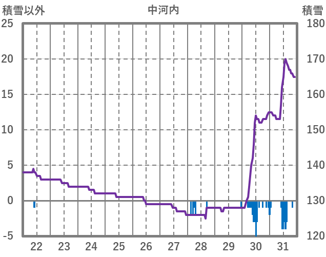 | 日 | 時 | 気温 | 降水 | 風向/風速 | 日照 | 積雪 | 降雪 |