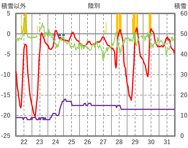 | 日 | 時 | 気温 | 降水 | 風向/風速 | 日照 | 積雪 | 降雪 |