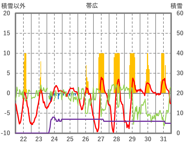| 日 | 時 | 気温 | 降水 | 風向/風速 | 日照 | 積雪 | 降雪 |