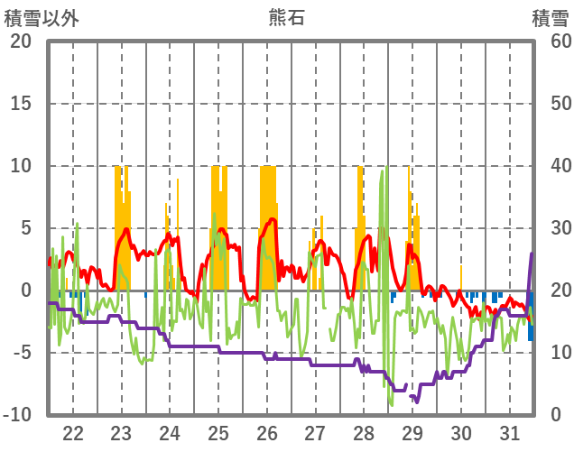 | 日 | 時 | 気温 | 降水 | 風向/風速 | 日照 | 積雪 | 降雪 |