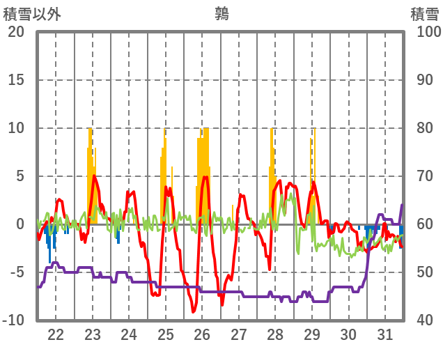 | 日 | 時 | 気温 | 降水 | 風向/風速 | 日照 | 積雪 | 降雪 |