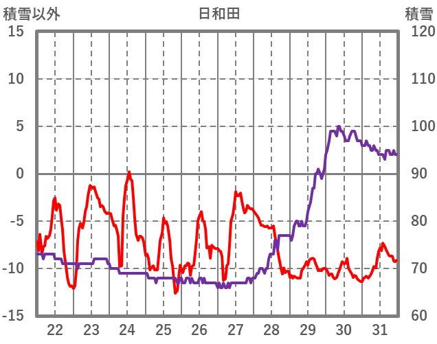 | 日 | 時 | 気温 | 降水 | 風向/風速 | 日照 | 積雪 | 降雪 |