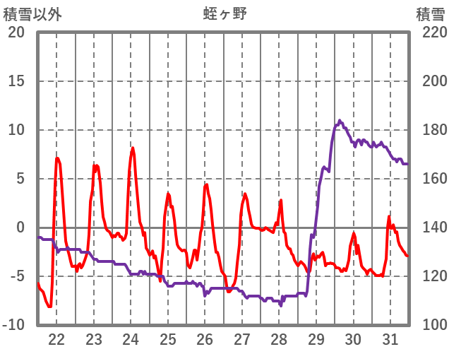 | 日 | 時 | 気温 | 降水 | 風向/風速 | 日照 | 積雪 | 降雪 |