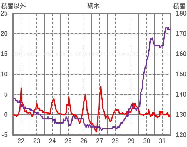 | 日 | 時 | 気温 | 降水 | 風向/風速 | 日照 | 積雪 | 降雪 |