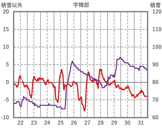 | 日 | 時 | 気温 | 降水 | 風向/風速 | 日照 | 積雪 | 降雪 |